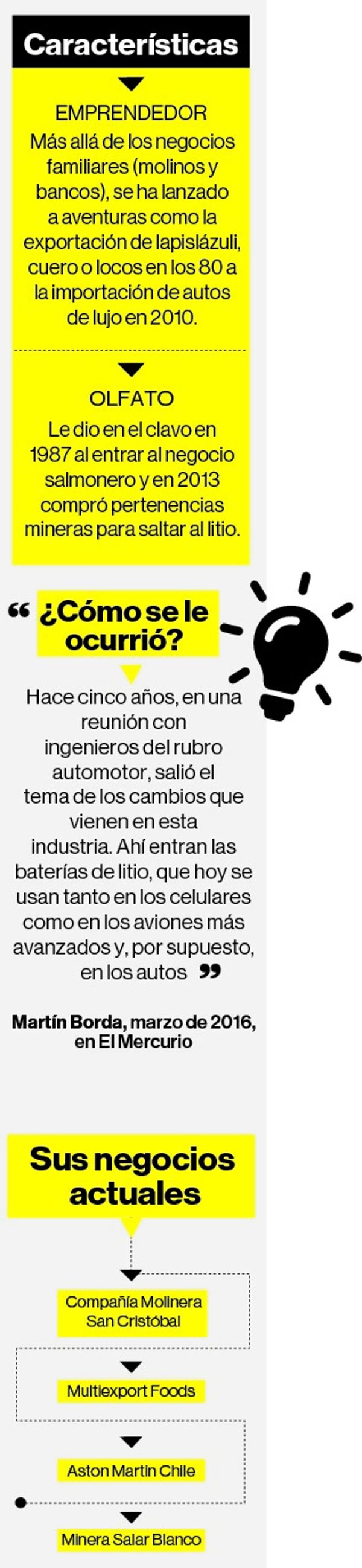Borda se quedó quieto con el salmón y el negocio bancario familiar hasta 2010, donde reactivó su olfato. Inauguró Aston Martin Santiago, la primera representación en Sudamérica de la marca inglesa de vehículos de lujo. Y de este gusto automotor surgió su interés en el litio.