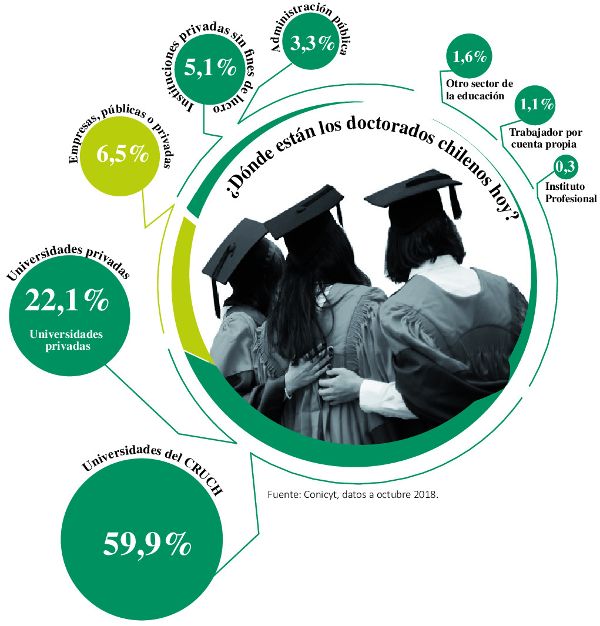 Según datos de Conicyt a octubre, sólo un 6,5% de los profesionales con grado de doctor en Chile trabaja en empresas. La Asociación Nacional de Investigadores de Postgrado (ANIP) dice que del total de PhD en el país, solo el 5,1% está en el sector privado. La diferencia es abismante respecto a países desarrollados: en Alemania, cerca del 40% de los doctores laboraba en empresas a 2017, el 37% en Dinamarca y el 35% en Estados Unidos. En España, eran el 20% en 2016.