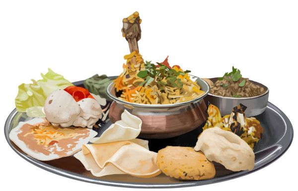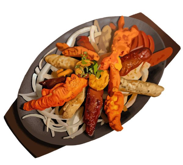 Esta plancha es un buen muestrario de las carnes más tradicionales en la cocina de este país. Son camarones sazonados con especias, trozos de pollo apanados en harina de garbanzos, rollitos de pollo y el infaltable cordero, también aderezado con especias. Todos se asan al tandoor, un horno cilíndrico típico de la India.