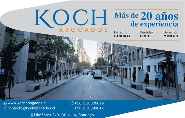Con más de 20 años de experiencia, Koch Abogados y Cía. Ltda. está enfocado en la actividad minera, atendiendo a empresas en materias laborales, civiles y mineras y en el campo de la Ley 20.720, el estudio apoya a las compañías en juicios laborales en las que están demandadas en acciones de tutela, despidos injustificados, nulidad de despido y cobro de prestaciones, en su carácter de empresa principal o mandante de firmas contratistas que están en proceso de liquidación concursal, cuando las interponen trabajadores subcontratados.