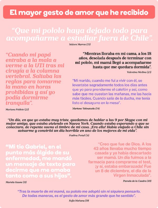 •Mientras lloraba en mi cama, a los 18 años, desolada después de terminar con mi pololo, mi mamá llegó a acompañarme hasta que me quedara dormida”. Valentina Medina (23)