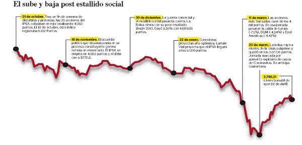 Efectivamente, el índice IPSA, que agrupa a las 30 acciones más transadas en la bolsa chilena, se ha recuperado un 30% desde el 18 de marzo, cuando se decretó estado de catástrofe. Ese día, el IPSA cerró en 2.876 puntos y ayer cerró en 3.748. Según los analistas, su desempeño hubiera sido mejor ayer de no haber sido por la caída de -2,44% del Dow Jones y la baja histórica del petróleo, que incluso cerró en precios negativos.